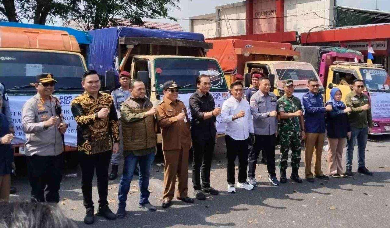 BABEL.PANGKALPINANG.SKT.COM – Anggota Komisi Pemilihan Umum (KPU) Republik Indonesia, Divisi perencanaan keuangan umum rumah tangga dan logistik Yulianto Sudrajat bersama Ketua KPU Pangkalpinang Sobarian dampingi Pj Wali Kota Pangkalpinang, M. Unu Ibnudin, memimpin pelepasan pendistribusian logistik kotak suara Pilkada Ulang Kota Pangkalpinang, Selasa (26/8/25).