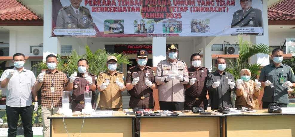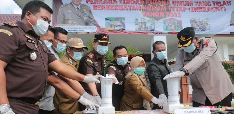 BABEL.KOBA.SKT.COM – Kejaksaan Negeri Bangka Tengah (Kejari Bateng) menggelar Pemusnahan Barang Bukti Perkara Tindak Pidana Umum yang Telah Berkekuatan Hukum Tetap (inkracht) Tahun 2025, di halaman Kantor Kejaksaan Negeri Bangka Tengah, Selasa (03/06/25).