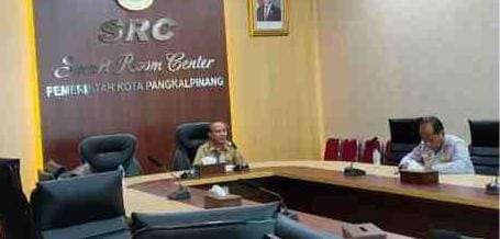 Rapat berlangsung secara virtual melalui Zoom Meeting dari Smart Room Center (SRC) Lantai 2 Kantor Wali Kota Pangkalpinang.
