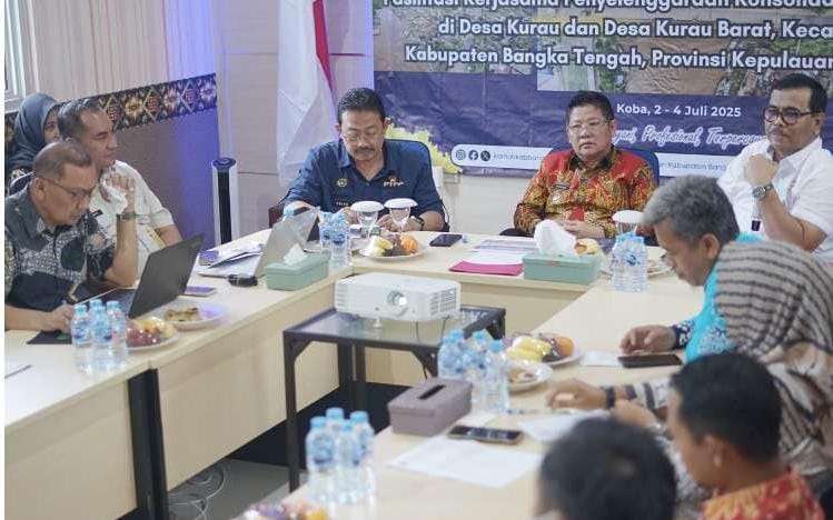 BABEL.KOBA.SKT.COM – Kantor Pertanahan (Kantah/BPN) Kabupaten Bangka Tengah bersama Pemerintah Kabupaten Bangka Tengah melakukan pemantauan dan evaluasi dalam rangka fasilitasi kerja sama penyelenggaraan Konsolidasi Tanah Wilayah II di Desa Kurau dan Desa Kurau Barat, Kecamatan Koba, yang digelar di Ruang Rapat Kantor Pertanahan Kabupaten Bangka Tengah, Kamis (03/07/25).